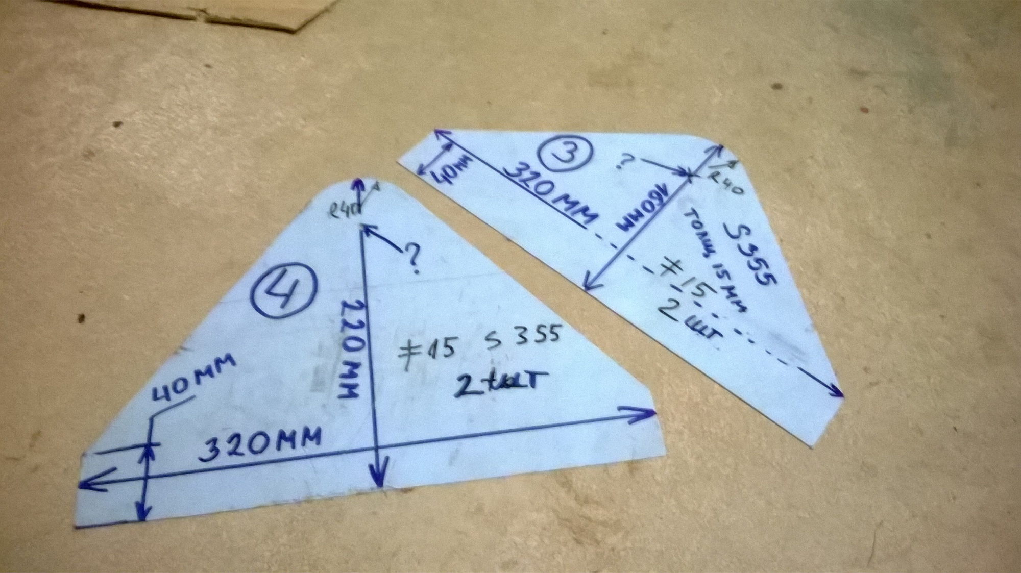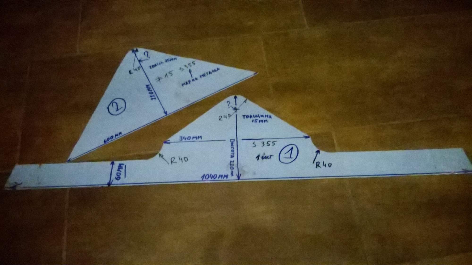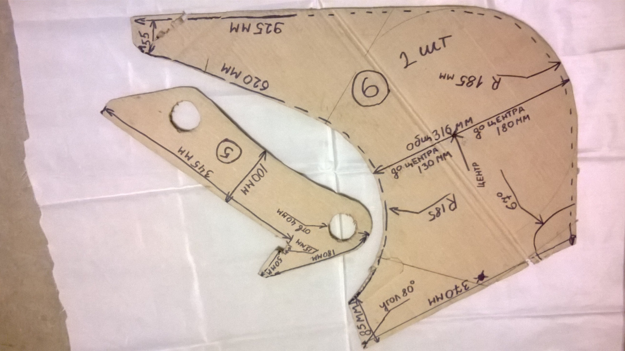 И так собираем сам ковш деталь №8 это дно ковша его нужно выгнуть по дет №6 да к стати дет №6 на фото видно какая она но там как получится,главное держите размер 925мм и370мм.Дет №7 это зад ковша всё это дело прихватываете не забудьте про лезвие когда начнёте капитально сваривать не забывайте чем дальше тем ковш тяжелее,сваривал всё полуавтоматом проволока не обмеднённая порошковая некоторые товарищи говорили что HARDOX проволокой не варят но всё получилось ни чего за пол года не отвалилось за исключением поломал наружные валы цилиндров какието хрупкие оказались когда пни берёзовые выкорчёвывалКовш менять лень было.Затем детали№1 и №2будут привариваться к ковшу НО НЕ СПЕШИТЕ добавил фотки Все треугольные детали собрал как они потом будут приварены прихватил между собой и просверлил отверстие 10мм скрепил болтом и проверил как это всё работает вроде ок.Отверстие от болта это будет центр для трубы на деталях №4 и для втулок на дет №1-2-3 труба прихватывается к дет №4 ,,,отверстия для трубы вырезал газом можно плазмой хорошо если руки не трясутся В деталях №4 отверстие под г цилиндр не забывайте что уши цилиндра большие следите чтобы они потом не стали задевать за трубу при поворотах.Цилиндры очень короткие у меня цилиндр вместе с гайкой и задним ухом 360мм плюс ухо штока 130мм,у нас в ГИДРОСКАНДЕ таких коротких не нашёл покупал длиннее всё в разборе, потом мерил обрезал варил у нас эти ГЦ продаются отдельно(колба с резьбой,гайка,дно,шток,поршень,уши,штуцера),:scrat ch_one-s_head: просто сам собираешь как конструктор ЛЕГО.На много дешевле чем купить готовый.,,,,,Дальше к дет №9 прихватываете дет№4и3 смотрите фото ковша,,с другой стороны дет№9 прихватываете детали №5 повторюсь деталь №5 от терекса960 лучше сделайте шаблон со своего имеющегося ковша.Ну как то так ,перекур спрашивайте что не понятно дети комп отбирают попозже заиду