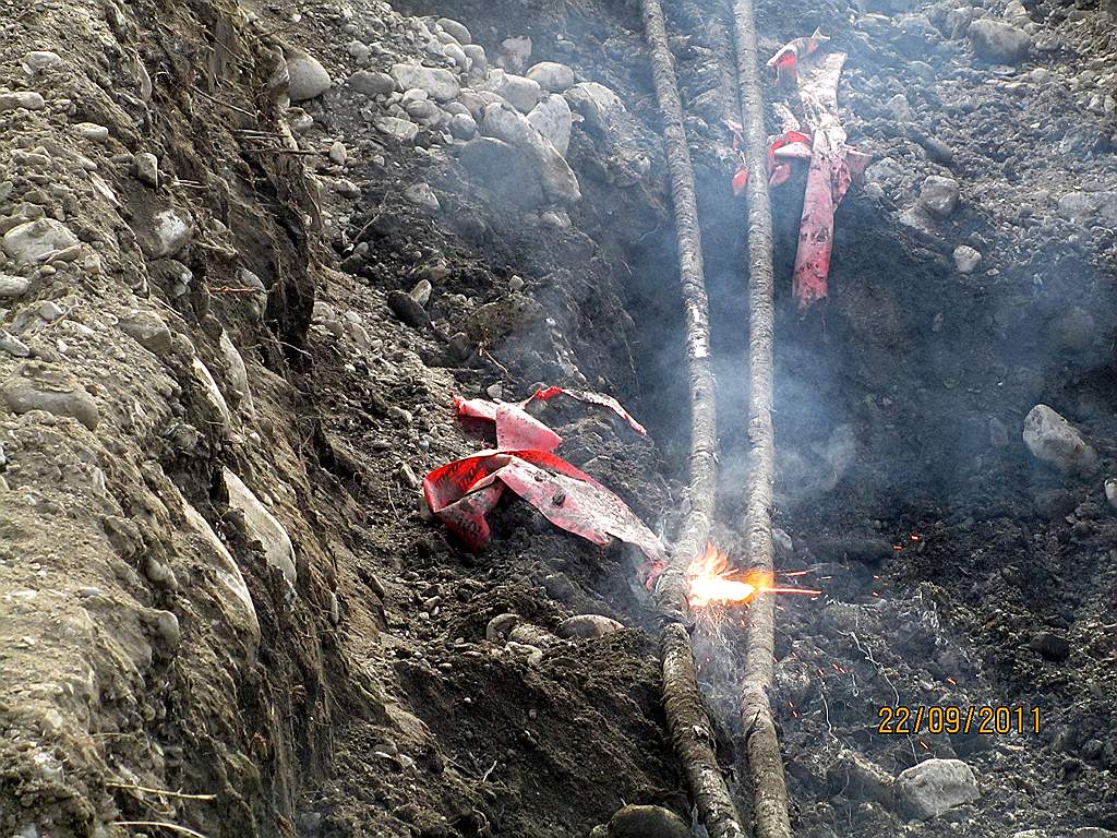 Стояла жара и + пятница. грунт ...одни кирпичи с камнями, пацан на лопате замучился шурфовать, да еще в этом эксе , предыдущий кулибин , клапана пережал, чтоб копать на холостых. стрелу дергает от малейшего косновения. короче котлован под 2 метра , вместо 70 сантов, а кабеля нет. костик говорит. возьми две булыги сбоку, а то лопату не воткнуть........ну и взял..... сначала пошел мини вулкан, потом зашипело и только тогда взрыв. под булыгами был. они и прикрыли весь хаос. воздух сразу становится другой.... смертью пахнет.
