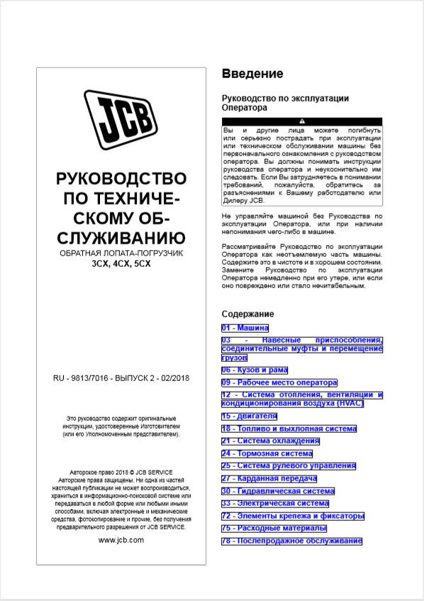 Добрый день. Требуется как можно более полное руководство по ремонту и обслуживанию JCB 4CX 2015 года выпуска. Желательно на русском.