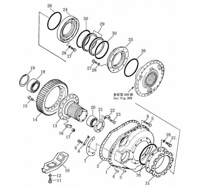 Добрый день! С зубчатой ступицы (позиция №13) снять втулку звёздочки (позиция 309 указана стрелочкой) и всё это находится в корпусе конечной передачи (№1). Вот эту процедуру надо проделать для замены уплотнений (№ 26,29,30)